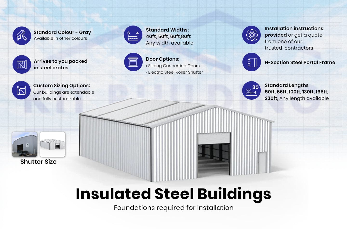 Wenn Sie eine starke und zuverlässige, dauerhafte Lagereinrichtung benötigen, dann ist das isolierte Stahlgebäude, das wir hier bei Kit Buildings anbieten, genau das Richtige für Sie. Hergestellt aus einem langlebigen und robusten Doppelfachwerk-Stahlrahmen und einer isolierten Sandwichpaneelverkleidung, ist dies die ultimative vorgefertigte Lagerlösung.