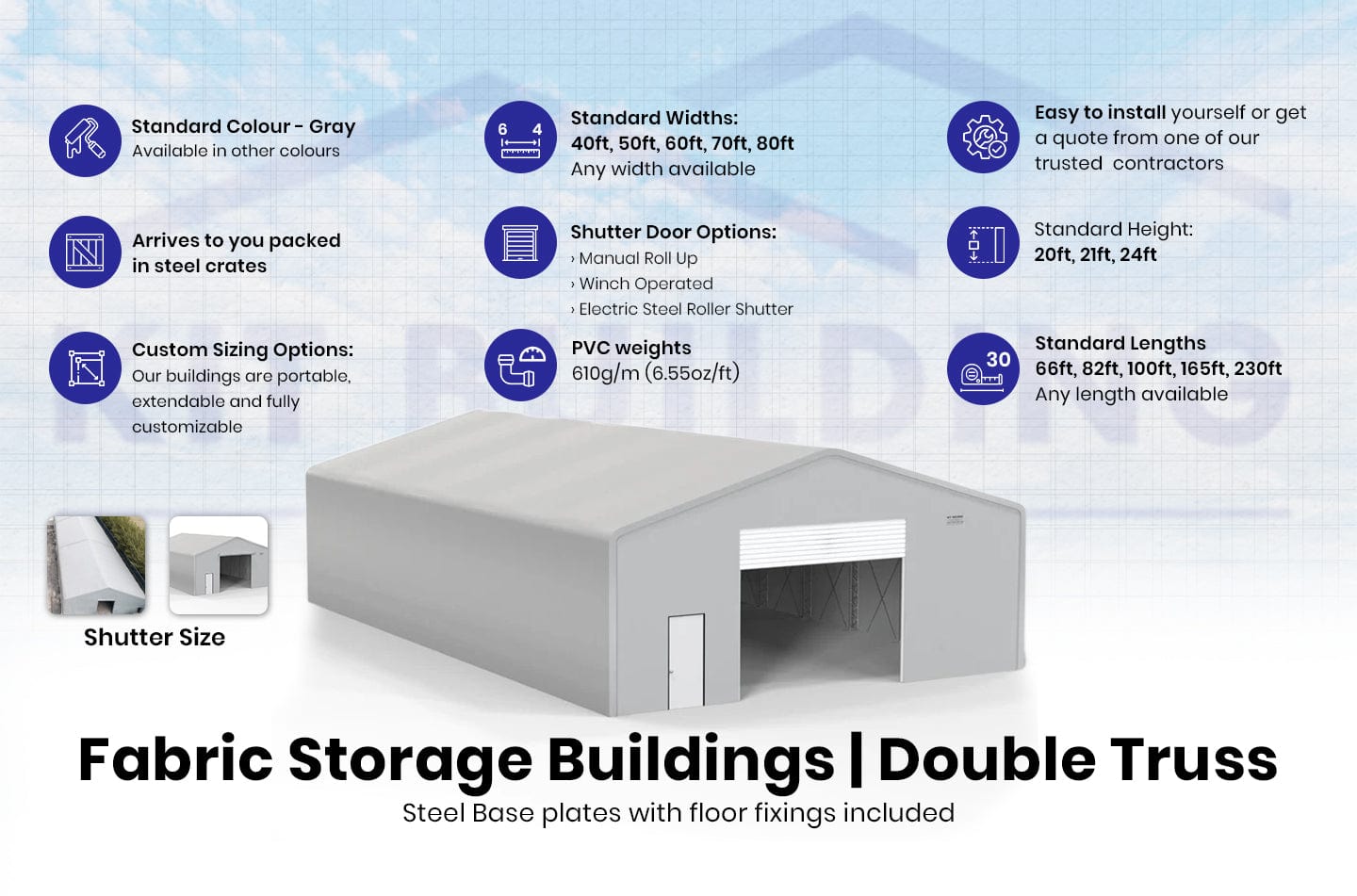 Bei Kit Buildings verwenden wir nur hochwertige Materialien, um sicherzustellen, dass unsere Strukturen langlebig, funktional und für die Ewigkeit gebaut sind. Alle unsere Gebäude werden mit verzinkten Stahlrahmen für überlegene Stärke und Korrosionsbeständigkeit konstruiert. Je nach Modell bieten wir eine Reihe von Verkleidungsoptionen an, darunter feuerhemmendes, UV-beständiges PVC-Gewebe und Stahlbleche im Profil. Für isolierte Gebäude können Sie aus EPS, Steinwolle oder PIR-Dämmung wählen, um Ihren spezifischen Anforderungen gerecht zu werden.