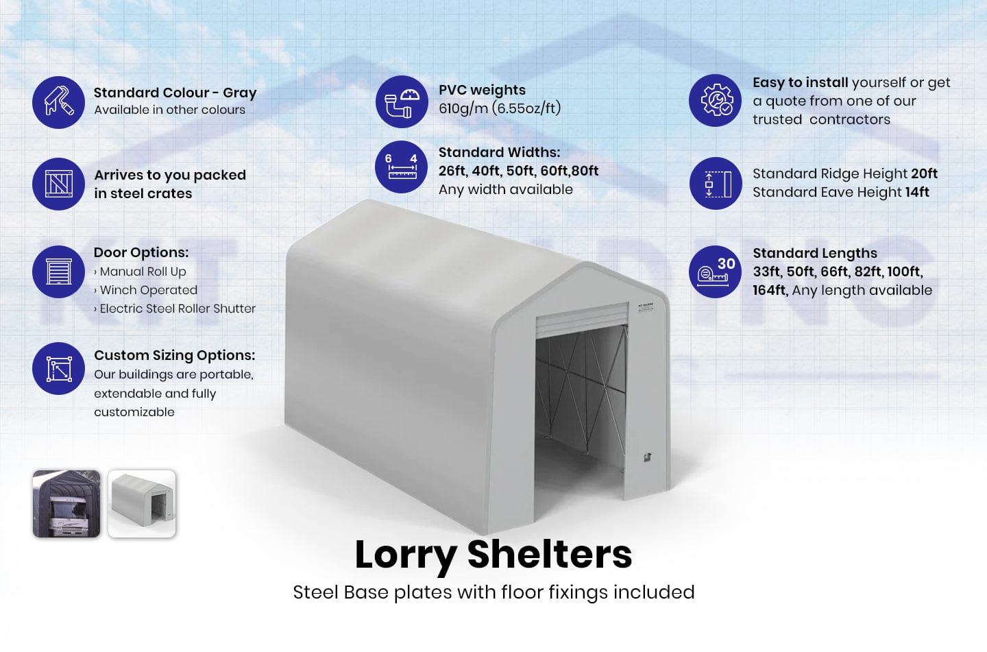 - Matériaux en tissu : Nous offrons une garantie produit de 5 ans sur nos tissus de bâtiment externes en PVC de 23 oz/sy (610g/m²), vous protégeant contre les défauts de matériau. Kit Buildings