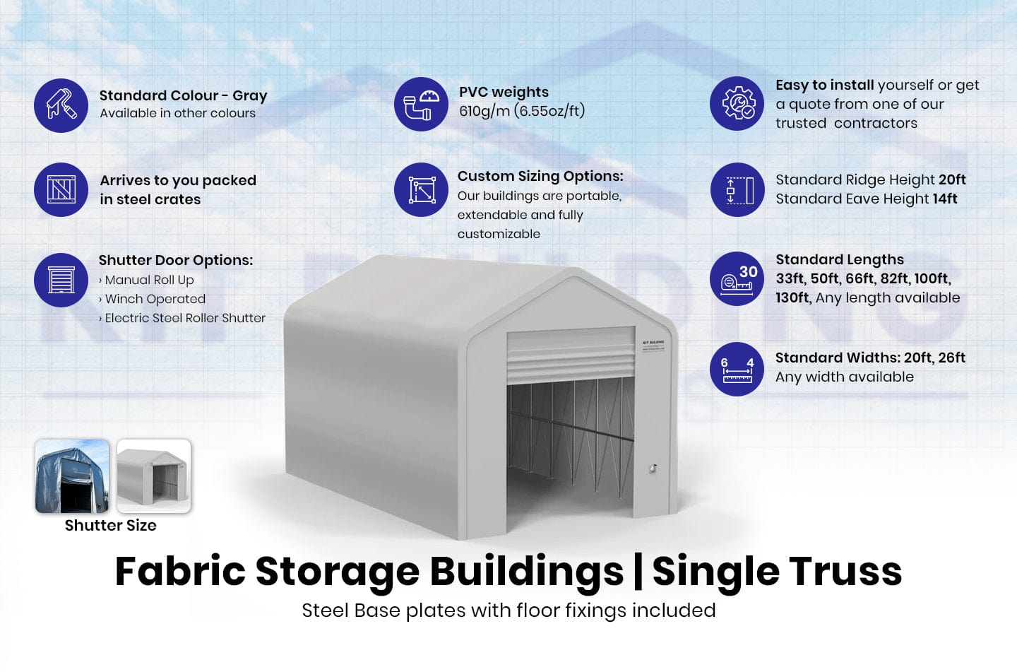 - Matériaux en tissu : Nous offrons une garantie produit de 5 ans sur nos tissus de bâtiment externes en PVC de 23 oz/sy (610g/m²), vous protégeant contre les défauts de matériau. Kit Buildings